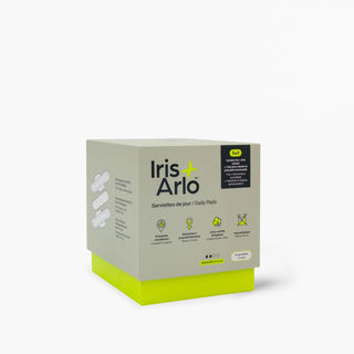 Une boîte de 10 serviettes menstruelles de jour signées Iris + Arlo en coton 100 % biologique, conçues pour offrir une protection optimale et naturelle.