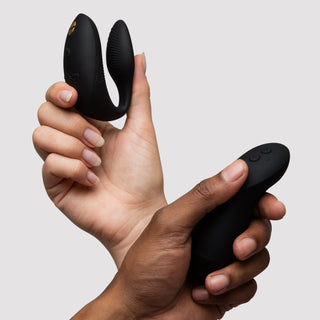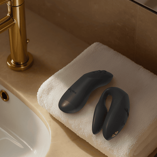 Un vibrateur pour couples de We-Vibe, offrant une stimulation simultanée du clitoris et du point G et contrôlable du bout des doigts grâce à sa télécommande haptique et à l’application We-Vibe.