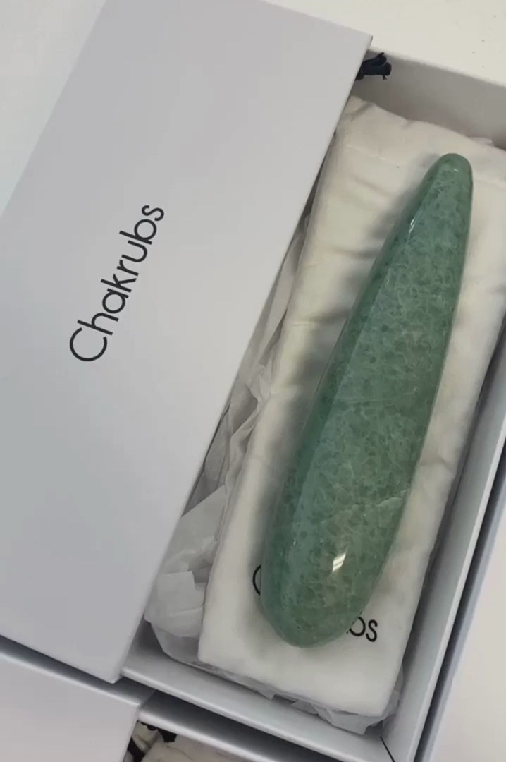 Un dildo sculpté dans la pierre d’aventurine verte, conçu par Chakrubs pour éveiller le corps et l’esprit à travers des sensations profondes et une énergie apaisante.