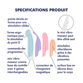 Un vibrateur 4-en-1 de Satisfyer avec embouts interchangeables pour explorer le clitoris, le point G et les zones externes selon tes envies.