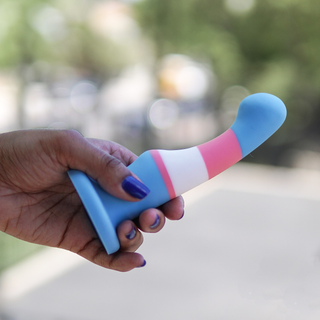 Un dildo de Blush aux couleurs du drapeau trans conçu pour stimuler le point G ou le point P et muni d’une base en ventouse.
