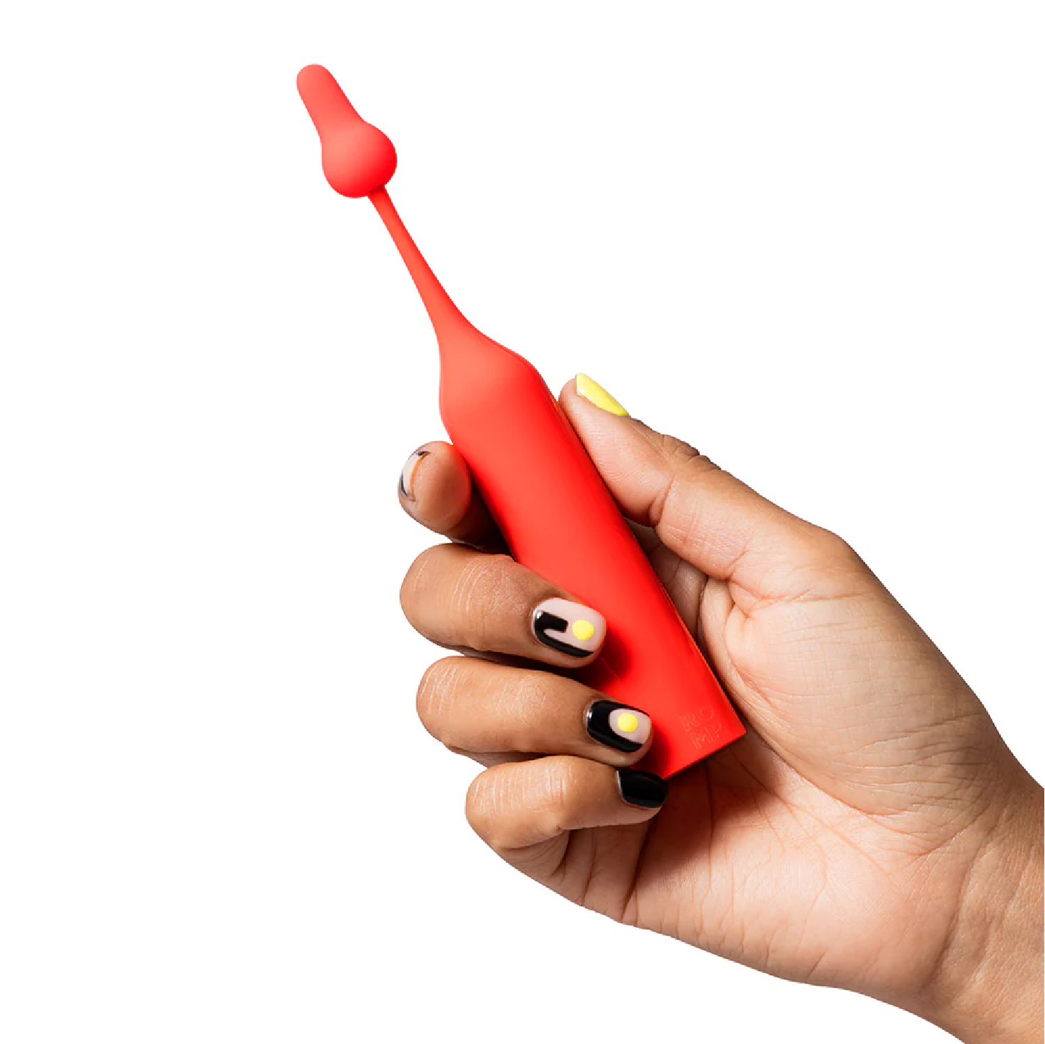 A clitoral stimulator by ROMP, designed to deliver precise, customizable vibrations thanks to its interchangeable tips.
