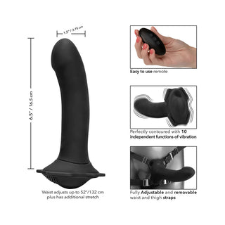 A vibrating dildo from Calexotics designed to stimulate the G-spot and equipped with a clitoral stimulator, usable solo or with the included harness.