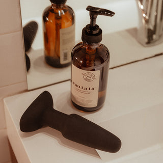 Submerger la Rimming Plug 2 de lubrifiant à base d’eau.Insérer doucement la Rimming Plug 2 dans l’anus en faisant de petits mouvements circulaires pour relaxer les muscles du rectum.